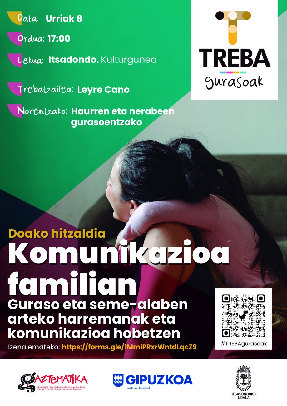 Urriaren 8an, 17:00etan, Itsasondoko Kulturgunean "Treba gurasoak" programaren barruan, "Komunikazioa familian. Guraso eta seme-alaben arteko harremanak eta komunikazioa hobetzen" hitzaldia izango dugu. Zaintza eta itzulpen zerbitzua egongo da( urriaren 3rako eskatu behar da)