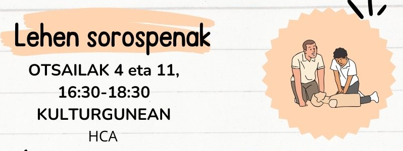 Otsailak 4 Asteazkena 16:30 HCA elkarteak eskainiko du lehen sorospen ikastaroa, Kulturgunean izango da, 16:30etik-18:30era. Zaintza eta xuxurlatzaile zerbitzuak eskainiko dira. Ekitaldi mota Bestelakoa
