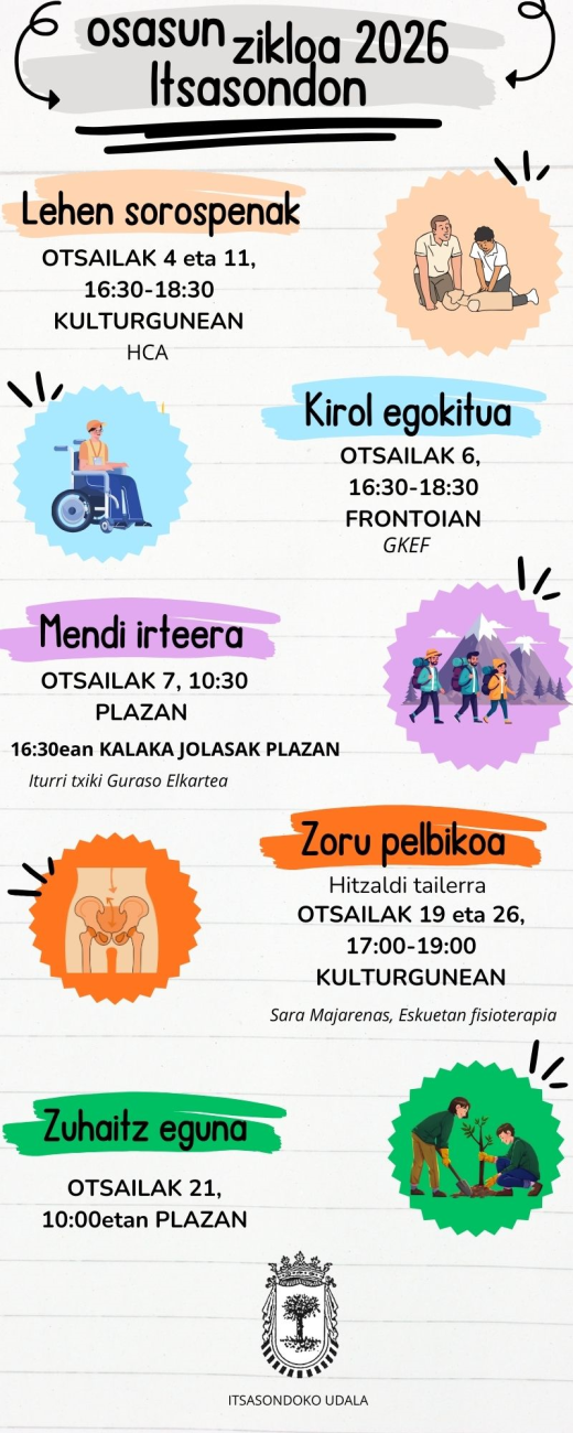 Otsailak 4 Asteazkena 17:00 Otsailean zehar osasunarekin loturiko hainbat jarduera izango ditugu. Agendan ikusgai. Ekitaldi mota Bestelakoa